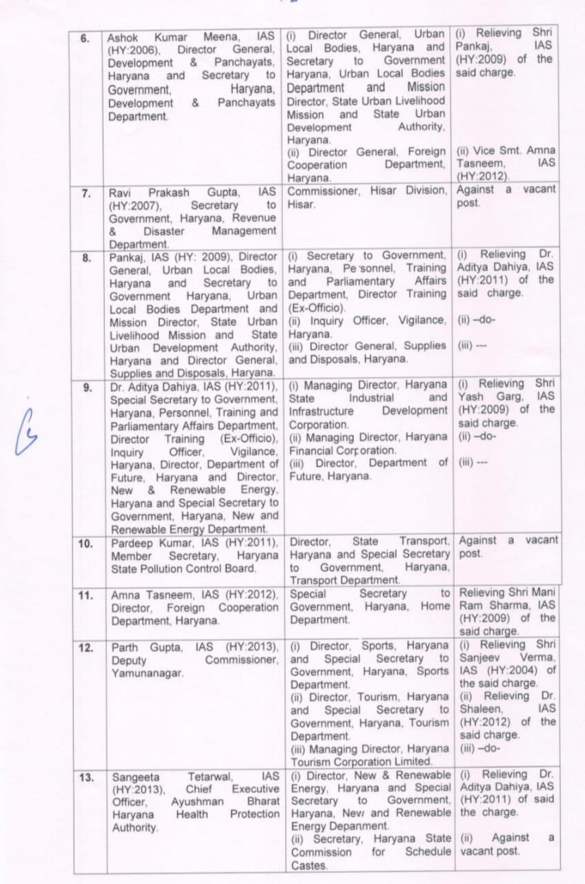 IAS जे. गणेशन (2006) को फरीदाबाद महानगरीय विकास प्राधिकरण (FMDA) के CEO के साथ-साथ कई महत्वपूर्ण जिम्मेदारियां दी गई हैं, जिनमें डायरेक्टर जनरल, हाउसिंग फॉर ऑल, और मैनेजिंग डायरेक्टर हारट्रोन भी शामिल हैं। IAS अशोक कुमार मीणा (2006) को शहरी स्थानीय निकाय विभाग का महानिदेशक बनाया गया है।