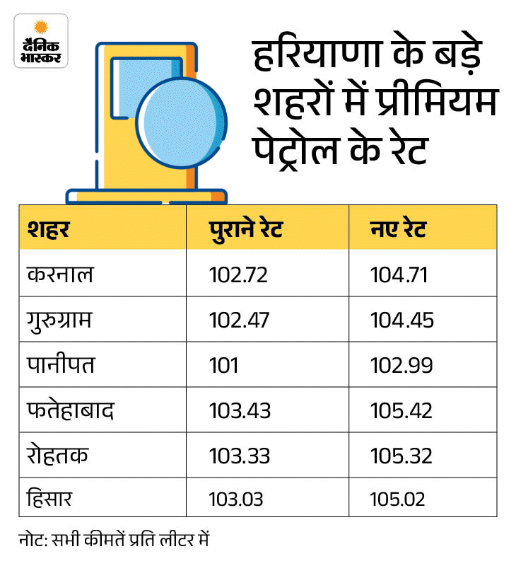 हरियाणा में सरकारी कंपनियों ने प्रीमियम पेट्रोल के दामों में बढ़ोतरी की।