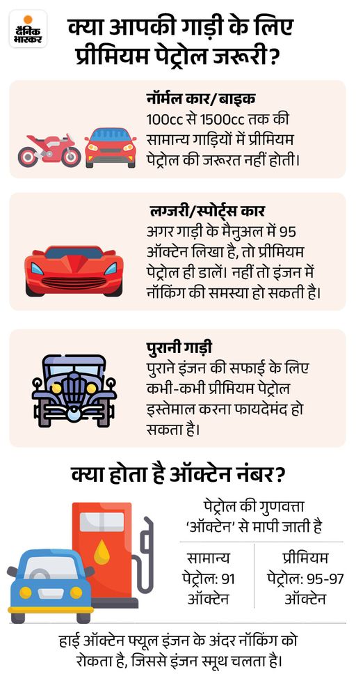 प्रीमियम पेट्रोल का ऑक्टेन नंबर 95 या उससे ज्यादा होता है। हाई-एंड इंजन वाली गाड़ियां इसी ईंधन पर बेहतर परफॉरमेंस देती हैं। कीमतों में 2 रुपए से ज्यादा की बढ़ोतरी होने से उन ग्राहकों का मंथली फ्यूल बजट बढ़ जाएगा जो अपनी गाड़ियों के इंजन की लंबी उम्र और बेहतर पिकअप के लिए प्रीमियम फ्यूल ही लेते हैं।