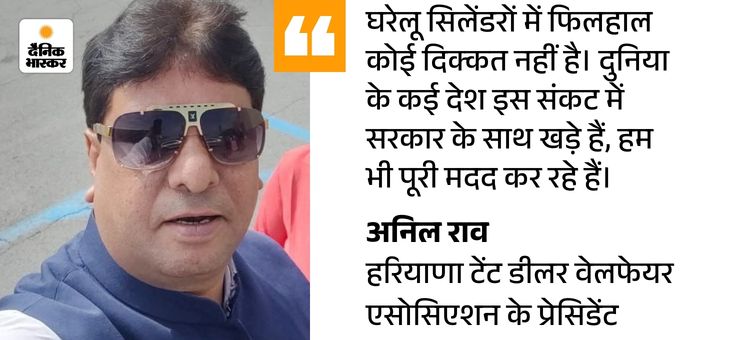 टेंट कारोबारी बोले- संकट में हम सरकार के साथ हरियाणा टेंट डीलर वेलफेयर एसोसिएशन के प्रेसिडेंट अनिल राव ने कहा कि मौजूदा हालात में उनका संगठन सरकार के साथ खड़ा है। उन्होंने कहा कि 12 मार्च को शादी का आखिरी सावा है, इसके बाद अप्रैल तक बड़े आयोजन नहीं हैं, इसलिए फिलहाल कॉमर्शियल सिलेंडरों की कमी से ज्यादा दिक्कत नहीं आएगी।