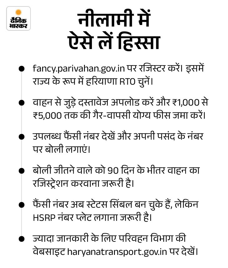 - 5 दिन में नंबर ब्लॉक करना होताः 5 दिन भीतर नंबर ब्लॉक करना होता है और बोली लगाई हुई फीस कटवानी होती है। अगर फीस नहीं कटवाते तो 4500 रुपए ब्लॉक हो जाते हैं। वह रिफंड नहीं होते और वह बोली से बाहर हो जाता है। इससे पहले पिछले सप्ताह ‘HR22W2222’ नंबर 37.91 लाख रुपए में बिका था।