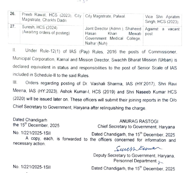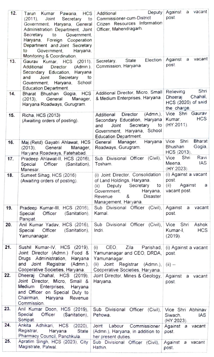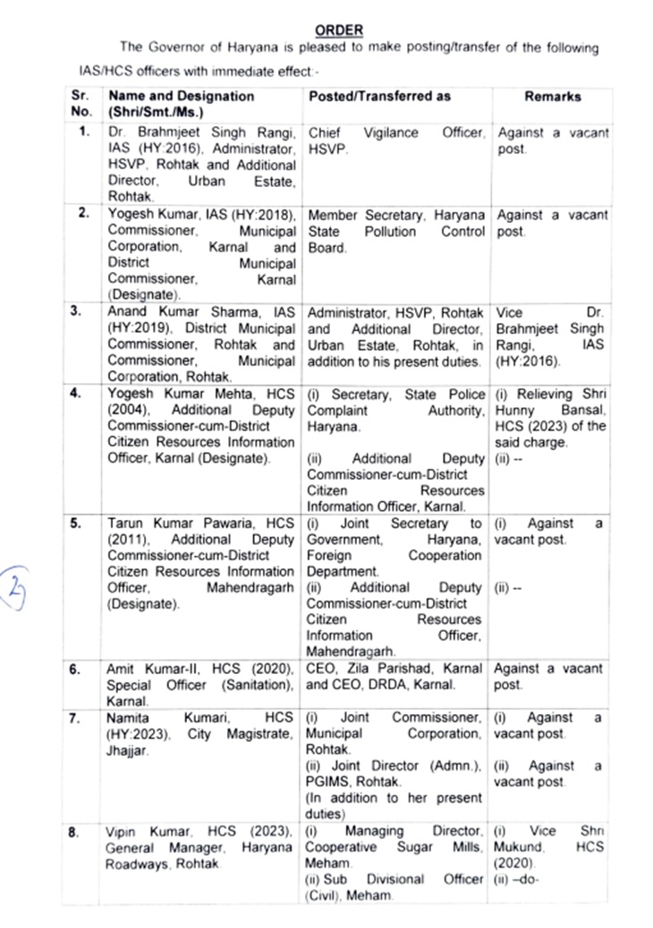 दूसरी लिस्ट में 8 अफसरों का नाम है। इनमें 3 IAS और 5 HCS अफसर हैं। IAS अफसर डॉ. ब्रह्मजीत सिंह रांगी को हरियाणा शहरी विकास प्राधिकरण (HSVP) में चीफ विजिलेंस ऑफिसर नियुक्त किया गया है।