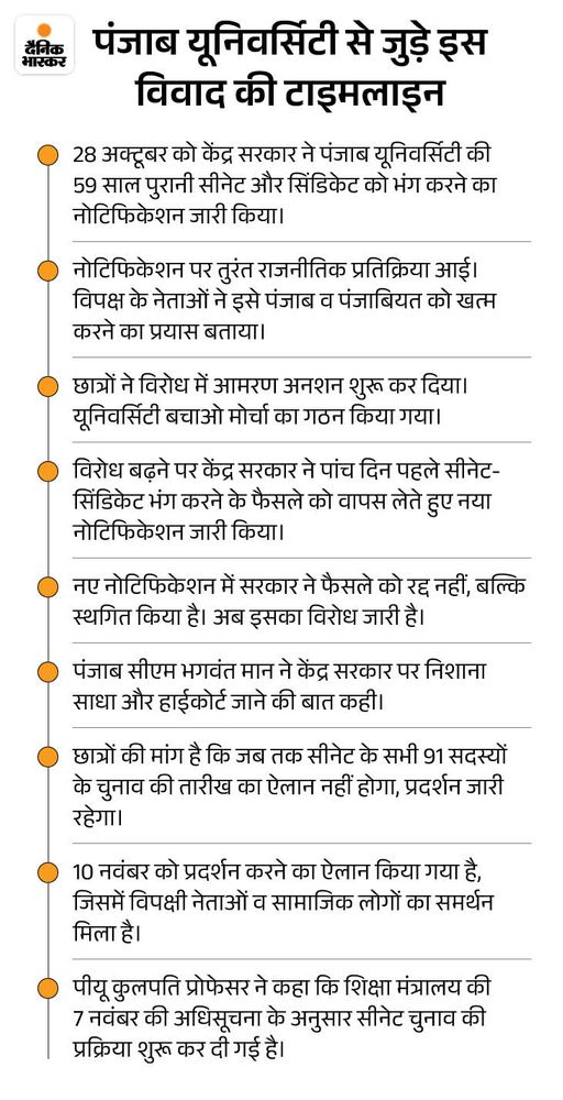 केंद्र सरकार ने भंग किया था सीनेट केंद्र सरकार की तरफ से 28 अक्तूबर को नोटीफिकेशन जारी कर सीनेट और सिंडिकेट को भंग कर दिया था। इसे लेकर पंजाब यूनिवर्सिटी में छात्रों की तरफ से प्रदर्शन किया जा रहा है। केंद्र सरकार ने अपने इस फैसले को वापस ले लिया, मगर अब छात्र संगठन जल्द से जल्द सीनेट चुनाव कराने की मांग कर रहे हैं। यूनिवर्सिटी की ओर से चुनाव का आश्वासन भी दिया गया है। लेकिन स्टूडेंट लिखित में जल्द चुनाव कराने की मांग पर अड़े हैं। इसी को लेकर तीन बार के सीनेटर हरप्रीत सिंह दुआ ने पंजाब एंड हरियाणा हाईकोर्ट में याचिका दायर की थी।