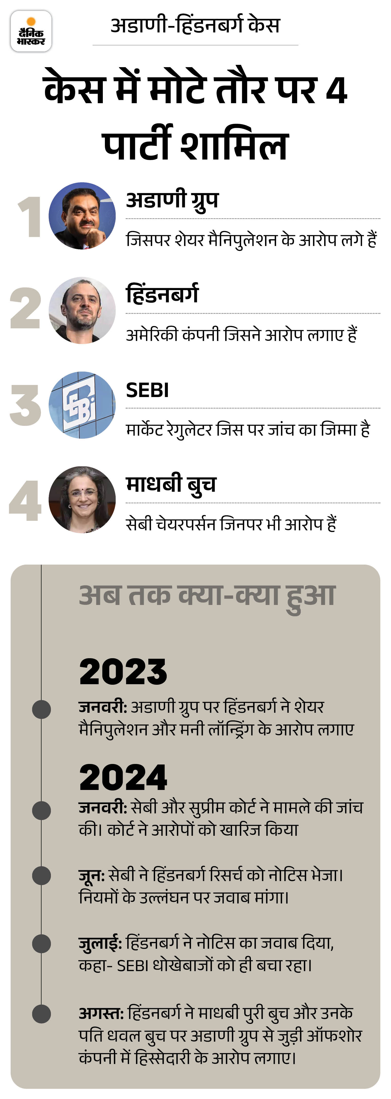 अगस्त में अमेरिकी रिसर्च कंपनी हिंडनबर्ग ने अपनी रिपोर्ट में दावा किया था कि माधबी पुरी बुच और उनके पति धवल बुच की अडाणी ग्रुप से जुड़ी ऑफशोर कंपनी में हिस्सेदारी है। वहीं बुच ने इन आरोपों को “निराधार” और “चरित्र हनन” का प्रयास बताया था।
