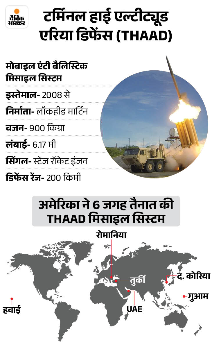 अमेरिकी रक्षा विभाग पेंटागन ने कहा कि THAAD से इजराइल का एयर डिफेंस सिस्टम और मजबूत होगा। THAAD और स्पेशल सैनिक एक सप्ताह के भीतर इजराइल भेजे जाएंगे। THAAD को बैलिस्टिक मिसाइल हमले को रोकने के लिए डिजाइन किया गया है। THAAD मिसाइलों को ट्रक पर लगे लॉन्चर से दागा जाता है।