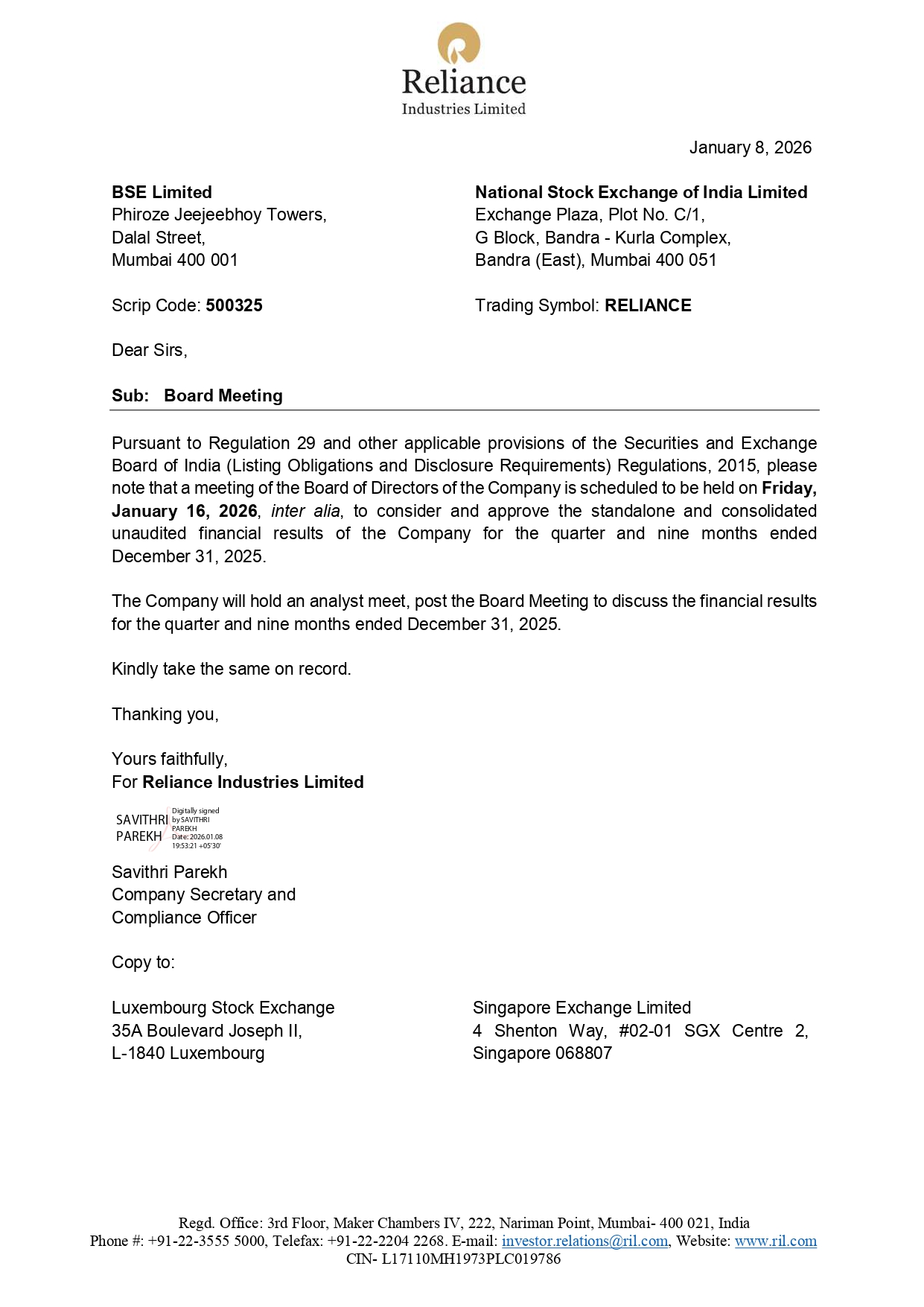 रिलायंस इंडस्ट्रीज (RIL) ने अपनी तीसरी तिमाही (Q3) के नतीजों की तारीख का ऐलान कर दिया है। कंपनी के बोर्ड मेंबर्स 16 जनवरी को होने वाली बैठक में 31 दिसंबर 2025 को समाप्त हुई तिमाही के वित्तीय परिणामों की समीक्षा करेंगे और उन्हें मंजूरी देंगे।
