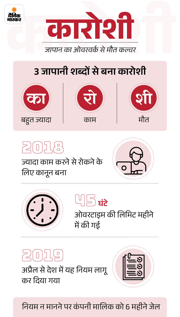 जापान में काम करने की स्टैंडर्ड लिमिट 8 घंटे प्रति दिन है। वहीं, ओवरटाइम की लिमिट प्रति महीने 45 घंटे है। यानी कि ऑफिस में बहुत ज्यादा काम की जरूरत हो तो स्टाफ से एक दिन में 9:30 घंटे काम कराए जा सकते हैं।