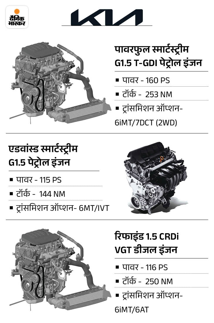 2026 किआ सेल्टोस में मैकेनिकली कोई भी बदलाव नहीं किया गया है। इसमें 3 इंजन और पांच ट्रांसमिशन ऑप्शन मिलते हैं। इसमें एक नया 1.5 लीटर का 4 सिलेंडर टर्बो GDI पेट्रोल इंजन दिया गया है, जो 160 PS की पावर और 253 NM का टॉर्क जनरेट करता है। ट्रांसमिशन की बात करें तो इस इंजन के साथ 6 स्पीड iMT और 7 स्पीड DCT का ऑप्शन मिलता है।