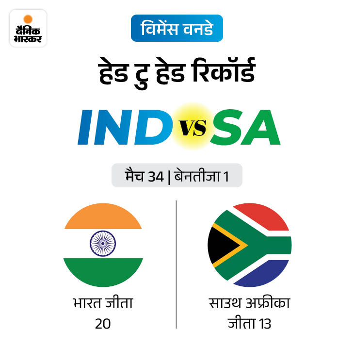 भारत के होमग्राउंड पर साउथ अफ्रीका विमेंस अब उन्हीं के खिलाफ 2 नवंबर को वर्ल्ड कप का फाइनल खेलेगी। दोनों टीमों के बीच वनडे में 34 मैच खेले गए, 20 में भारत और 13 में साउथ अफ्रीका को जीत मिली।