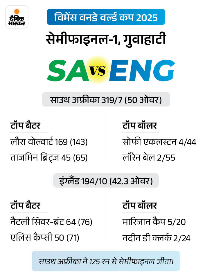 लगातार 2 फाइनल हारने के बाद साउथ अफ्रीका ने 2025 के विमेंस वनडे वर्ल्ड कप सेमीफाइनल में एंट्री कर ली। लीग स्टेज में टीम ने इंग्लैंड और ऑस्ट्रेलिया के खिलाफ 2 मैच गंवाए। दोनों ही बार टीम पहले बैटिंग करते हुए 100 रन भी नहीं बना सकी। इंग्लैंड ने तो उन्हें 69 पर समेट दिया था।