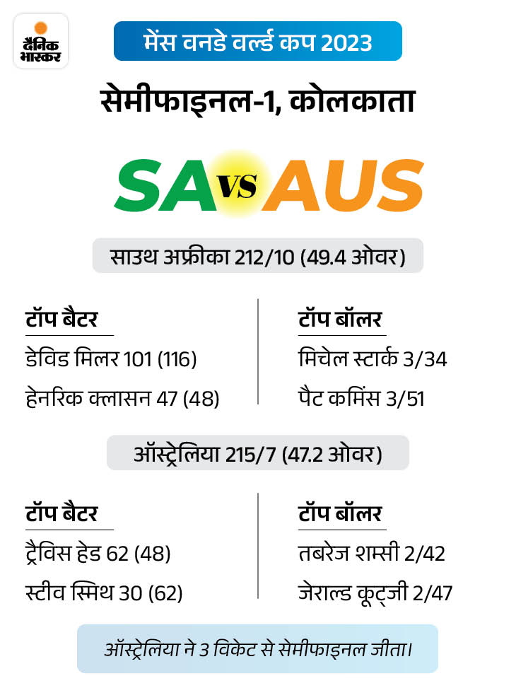 हेनरिक क्लासन और डेविड मिलर ने टीम को 100 के पार पहुंचाया। क्लासन 47 रन बनाकर आउट हो गए। उनके बाद मिलर अकेले पड़ गए, उन्होंने सेंचुरी लगाई, लेकिन टीम को 212 तक ही पहुंचा सके। छोटे टारगेट के सामने ऑस्ट्रेलिया ने भी 193 रन तक 7 विकेट गंवा दिए, लेकिन मिचेल स्टार्क और कप्तान पैट कमिंस ने पार्टनरशिप कर टीम को फाइनल में पहुंचा दिया।