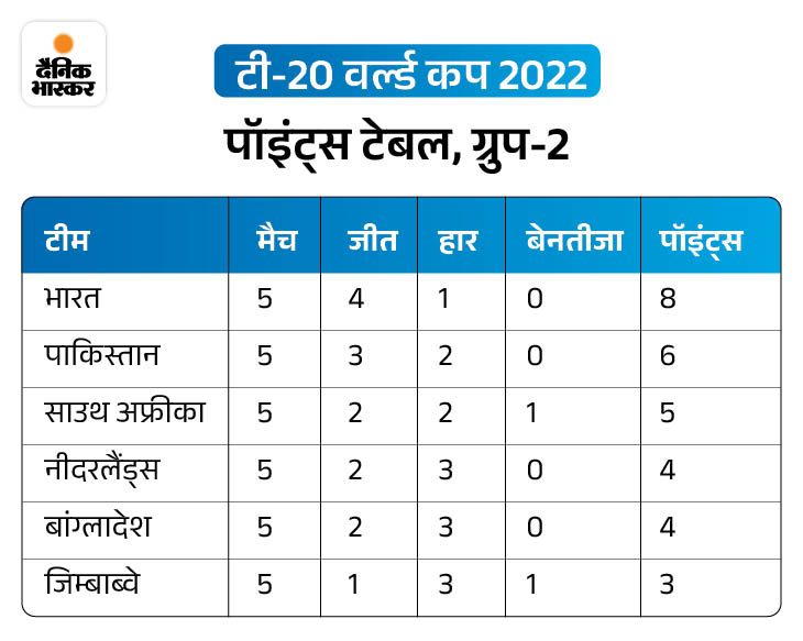ग्रुप-2 में टीम ने बांग्लादेश और भारत को हरा दिया। जिम्बाब्वे के खिलाफ मुकाबला बेनतीजा रहा। नॉकआउट में पहुंचने के लिए टीम को पाकिस्तान और नीदरलैंड के खिलाफ आखिरी 2 में से कोई एक ही मैच जीतना था। पाकिस्तान से तो टीम हार गई, लेकिन नीदरलैंड को पहली पारी में 158 रन ही बनाने दिया।