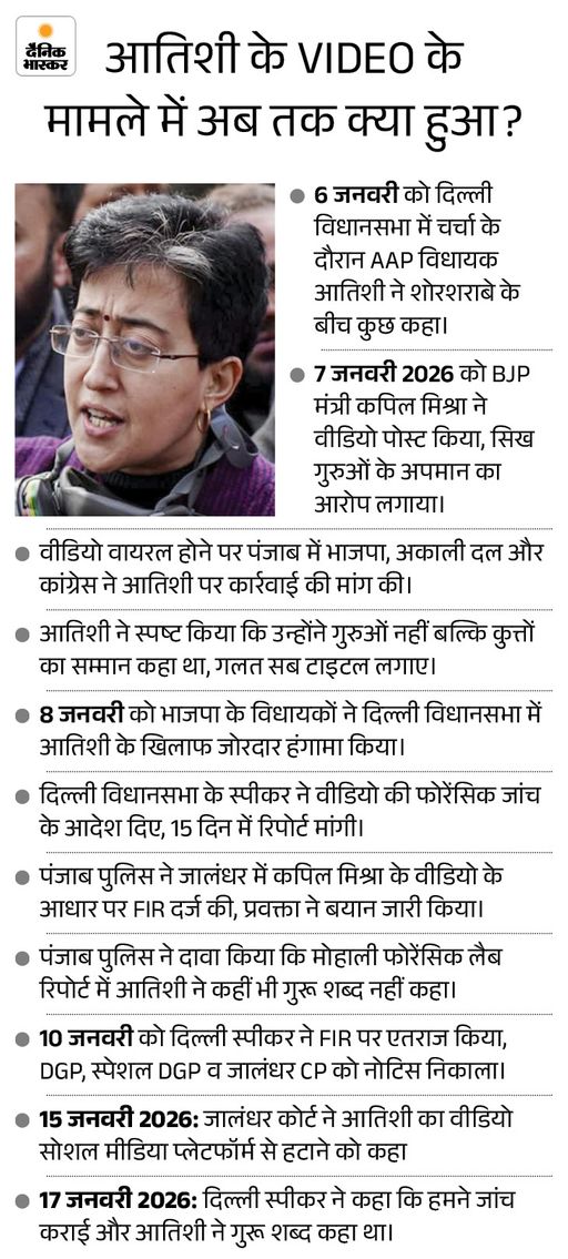 कोर्ट ने वीडियो हटाने के दिए आदेश मालविंदर सिंह कंग ने कहा कि जालंधर कोर्ट ने 15 जनवरी 2026 को इस वीडियो को फर्जी और छेड़छाड़ वाला करार देते हुए सोशल मीडिया प्लेटफॉर्म्स (जैसे X, Meta, Telegram) से इसे तुरंत हटाने और ब्लॉक करने का आदेश दिया। पंजाब पुलिस की फॉरेंसिक साइंस लेबोरेटरी (मोहाली) की रिपोर्ट में भी स्पष्ट हुआ कि मूल वीडियो में आतिशी ने ‘गुरु’ या ‘गुरुओं’ का कोई जिक्र नहीं किया था। रिपोर्ट 9 जनवरी 2026 की है, जिसमें वीडियो को मैनिपुलेटेड पाया गया।