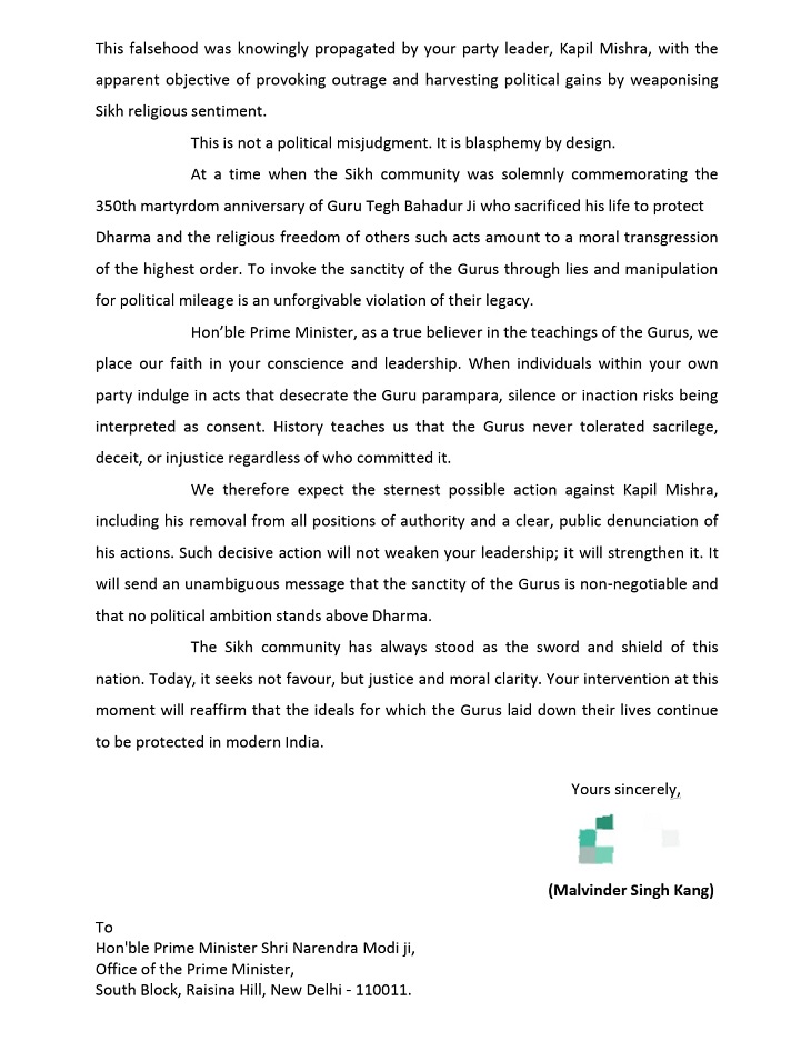 जानबूझकर यह सारी कोशिश की गई कंग ने पत्र में लिखा कि कपिल मिश्रा ने जानबूझकर यह फर्जी वीडियो शेयर कर सिख समुदाय की भावनाओं को ठेस पहुंचाई और धार्मिक उन्माद फैलाने की कोशिश की। उन्होंने प्रधानमंत्री से अपील की कि भाजपा ऐसे नेताओं को पार्टी में बनाए रखने पर विचार करें और सख्त कदम उठाकर सिख समुदाय को न्याय दिलाया जाए।