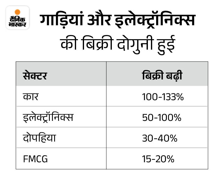 बीते एक हफ्ते में कारें, मोटरसाइकिलें, टीवी, ब्यूटी प्रोडक्ट्स और प्रीमियम घड़ियों की बिक्री दोगुनी हो गई है। इस साल ग्रामीण इलाकों में ज्यादा उत्साह देखा जा रहा है। मारुति सुजुकी, हुंडई और टाटा मोटर्स का कहना है कि नवरात्र में अब तक उनकी बिक्री 100-133% बढ़ चुकी है।
