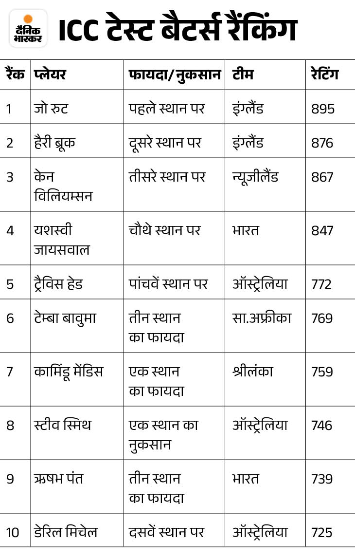 भारत के यशस्वी जायसवाल 847 पॉइंट्स के साथ नंबर-4 पर बरकरार हैं। वहीं ऑस्ट्रेलिया के ट्रैविस हेड नंबर-5 पर हैं। उनकी रेटिंग 772 है। श्रीलंका के कामिंडू मेंडिस को एक स्थान का उछाल मिला है। वह अब 759 रेटिंग पॉइंट्स के साथ नंबर-7 पर पहुंच गए हैं। ऑस्ट्रेलिया के स्टीव स्मिथ को एक पायदान का नुकसान हुआ। वह नंबर 8 पर आ गए। न्यूजीलैंड के डेरिल मिचेल 725 की रेटिंग के साथ नंबर 10 पर बने हुए हैं।