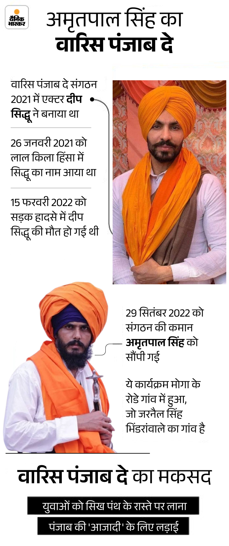 अमृतपाल को मोगा जिले के रोडे गांव से गिरफ्तार किया गया था। इस गिरफ्तारी के पीछे आरोप था कि वे खालिस्तानी मांगों का समर्थन करते हुए सामाजिक अस्थिरता फैला रहा था। जिसमें पुलिस पर हमले के अलावा अजनाला पुलिस थाने पर कब्जा करने के जैसे गंभीर मामले भी शामिल थे।
