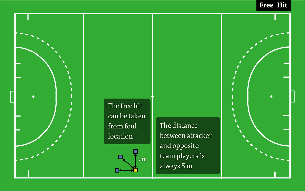 A free hit is given when a foul is made outside of the Dee. For instance, if the ball hits the foot of a player, the opposite team gets a free hit. This is similar to how the ball is played in the beginning, with the same 5m distance between the striker and defending players. However, the location where it is taken from changes.