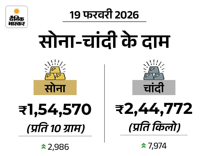 सोना-चांदी के दाम में 19 फरवरी को लगातार दूसरे दिन तेजी है। इंडिया बुलियन एंड ज्वेलर्स एसोसिएशन (IBJA) के अनुसार, 10 ग्राम 24 कैरेट सोना 2,986 रुपए बढ़कर होकर ₹1.55 लाख पहुंच गया है। वहीं, एक किलो चांदी 7,974 रुपए बढ़कर ₹2.45 लाख पर पहुंच गई है।