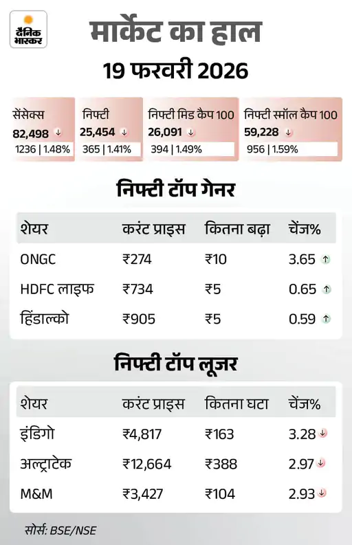 शेयर बाजार में आज यानी 19 फरवरी को गिरावट है। सेंसेक्स 1236 अंक (1.48%) की गिरावट के साथ 82,498 के स्तर पर बंद हुआ। निफ्टी में भी 365 अंक (1.41%) की गिरावट रही, ये 25,454 के स्तर पर बंद हुा। ऑटो, रियल्टी और बैंकिंग शेयर्स ज्यादा टूटे हैं।