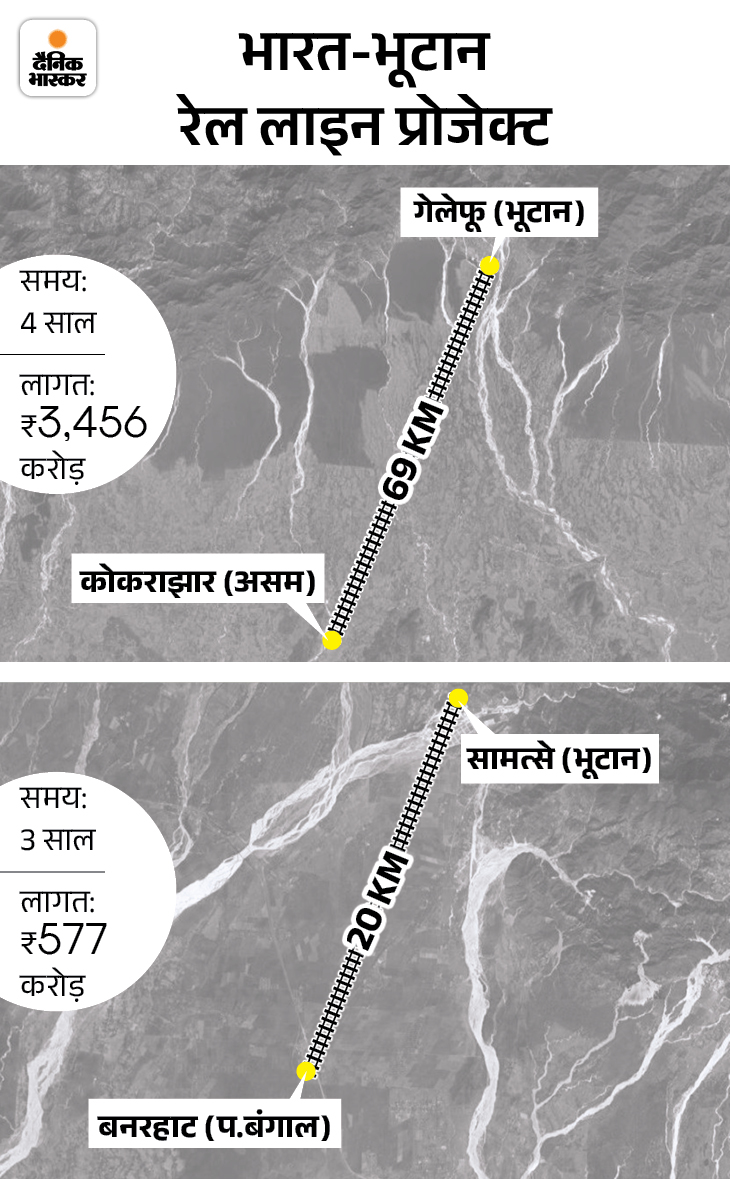 अभी पश्चिम बंगाल में हासीमारा तक ट्रेन थी, अब ये सीधे भूटान के गेलेफू तक जाएगी। 89 किमी लंबे इन दो रेल प्रोजेक्ट्स पर ₹4,033 करोड़ खर्च होंगे।