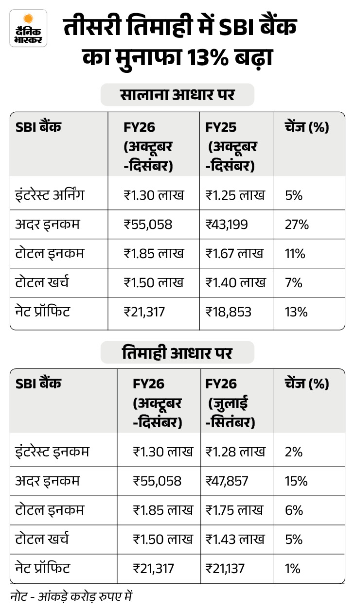 वहीं तीसरी तिमाही में SBI की इंटरेस्ट अर्निंग 1.30 लाख करोड़ रुपए रही। पिछले साल की समान तिमाही में यह 1.24 लाख करोड़ रुपए थी। सालाना आधार पर यह 5% बढ़ी है।