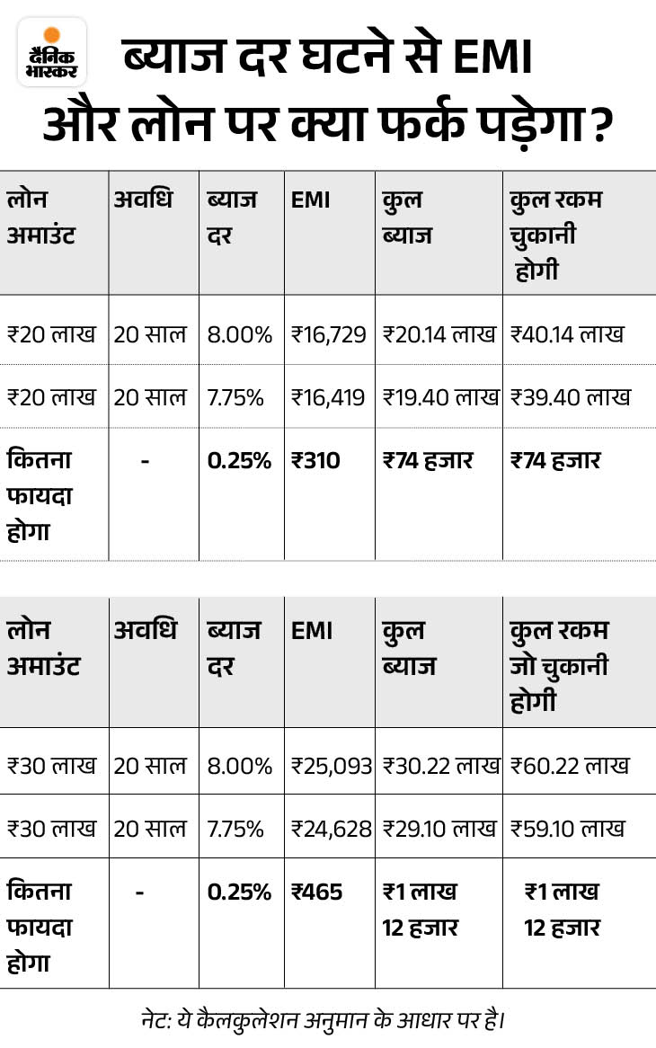 • नए लोन लेने वालों के लिए: अगर आप नया होम लोन लेने की सोच रहे हैं, तो अब आपको कम ब्याज देना होगा। उदाहरण के लिए SBI नए होम लोन की ब्याज दर पहले 7.50% से शुरू होती थी अब ये घटकर करीब 7.25% हो जाएगी।