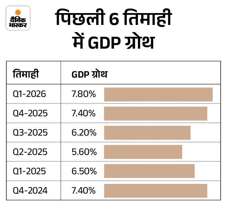 भारत समेत दुनिया में US टैरिफ का दबाव है, प्राइवेट इन्वेस्टमेंट सुस्त है, फिर भी भारत की अर्थव्यवस्था जुलाई-सितंबर तिमाही में 8.2% की दर से बढ़ी है। यह पिछली 6 तिमाही में सबसे ज्यादा है। पिछले साल की समान तिमाही में GDP 5.6% थी। वहीं अप्रैल-जून में ये 7.8% थी।