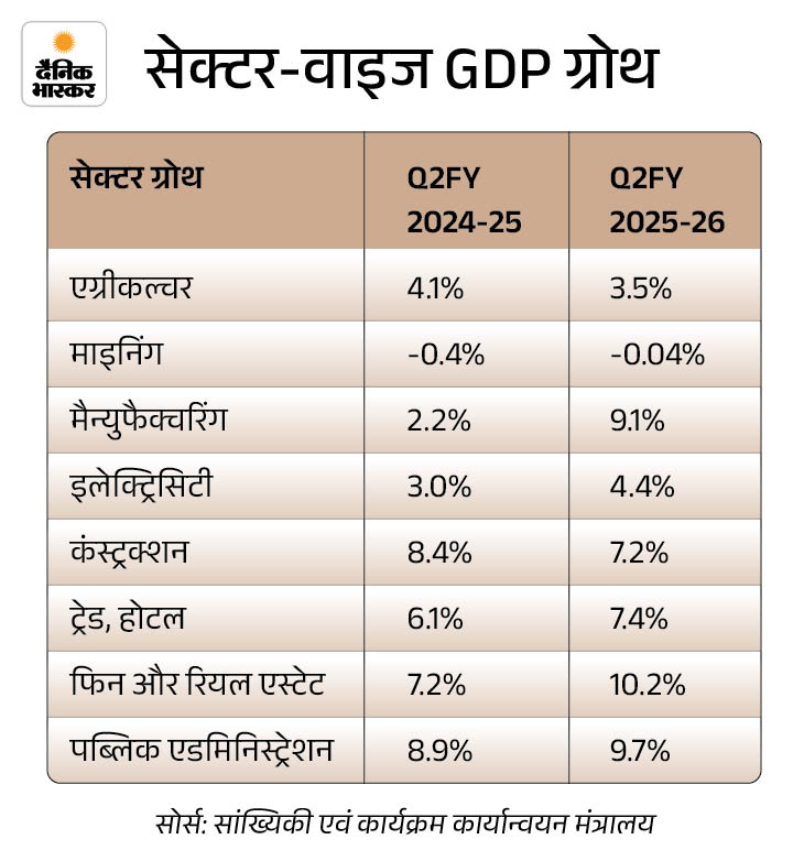 1 अक्टूबर को रिजर्व बैंक (RBI) ने मॉनेटरी पॉलिसी मीटिंग में FY26 के लिए इकोनॉमी ग्रोथ का अनुमान 6.5% से बढ़ाकर 6.8% कर दिया था। मतलब दूसरी तिमाही में GDP ग्रोथ RBI के अनुमान से भी बेहतर रही है।
