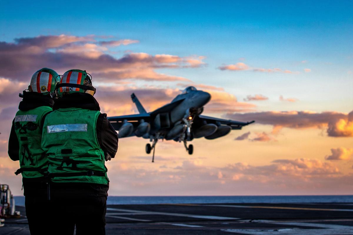 This image provided by U.S. Central Command shows a F/A-18E Super Hornet preparing for an arrested landing on the USS Gerald R. Ford (CVN 78) after a mission in support of Operation Epic Fury, on February 28, 2026.