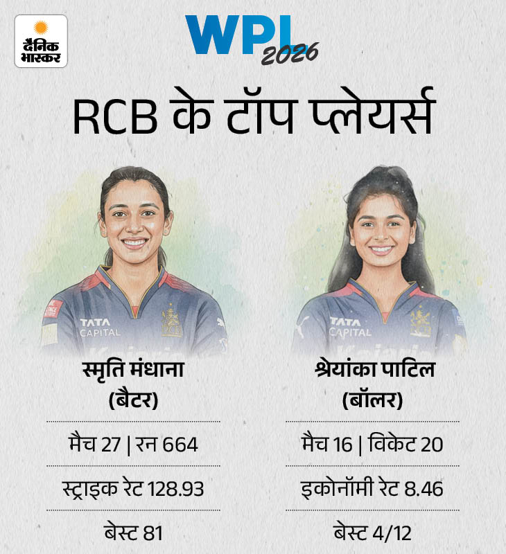 क्लार्क ने पिछले मैच में नाबाद 63 रन बनाए RCB की कप्तान और स्टार बल्लेबाज स्मृति मंधाना ने टीम के लिए अब तक 27 मैच खेले हैं, जिनमें 664 रन बनाए हैं। इस दौरान उनका बेस्ट स्कोर 81 रन रहा है। मंधाना टीम की टॉप स्कोरर हैं। गेंदबाजी में श्रेयांका पाटिल ने टीम के लिए अहम भूमिका निभाई है। उन्होंने 16 मैचों में 20 विकेट हासिल किए हैं। वहीं, RCB के लिए पिछले मैच में नादिन डी क्लार्क ने नाबाद 63 रन बनाए और चार विकेट लिए थे। टीम को यूपी वॉरियर्स के खिलाफ भी ऐसे ही प्रदर्शन की उम्मीद होगी।